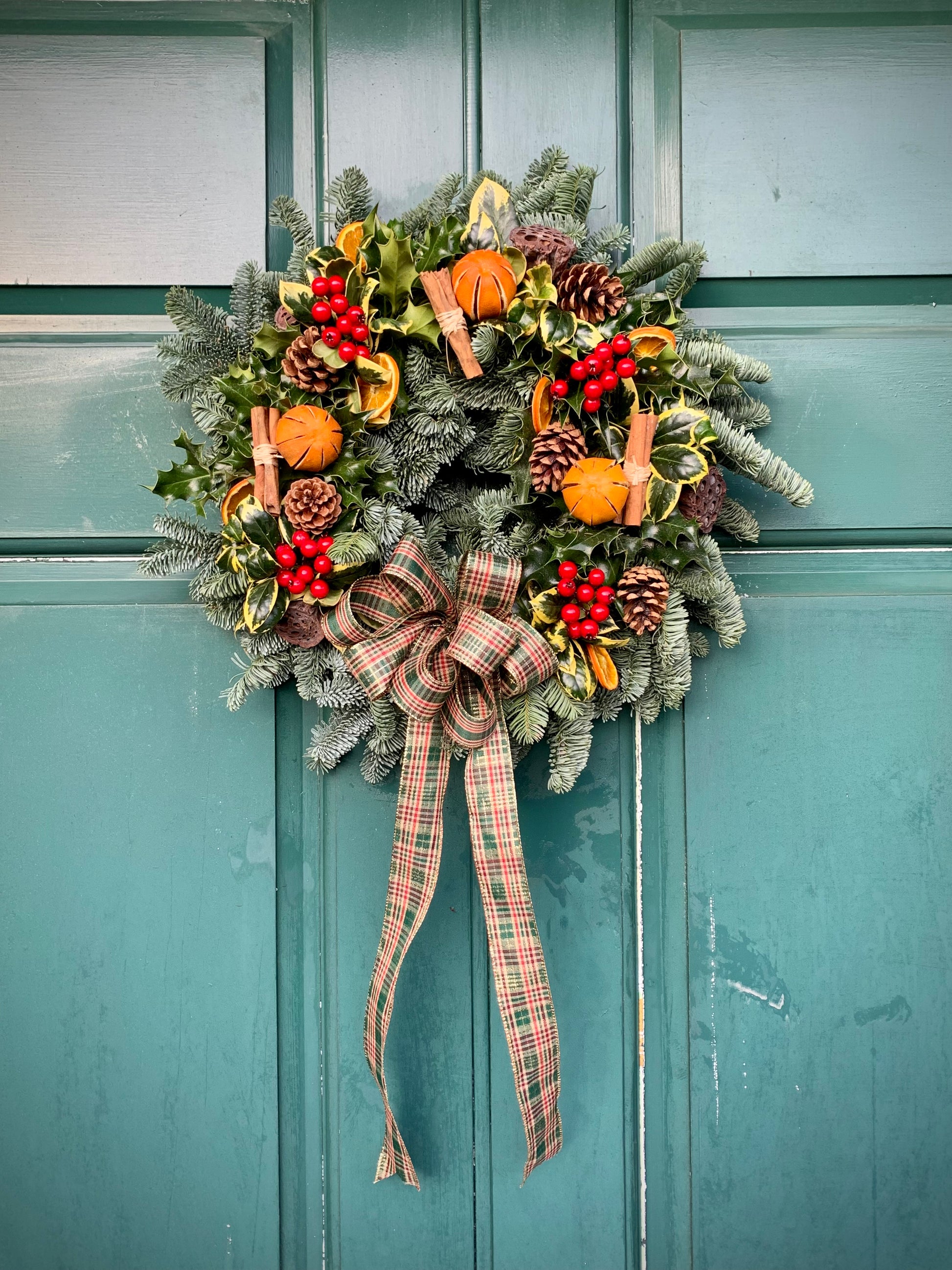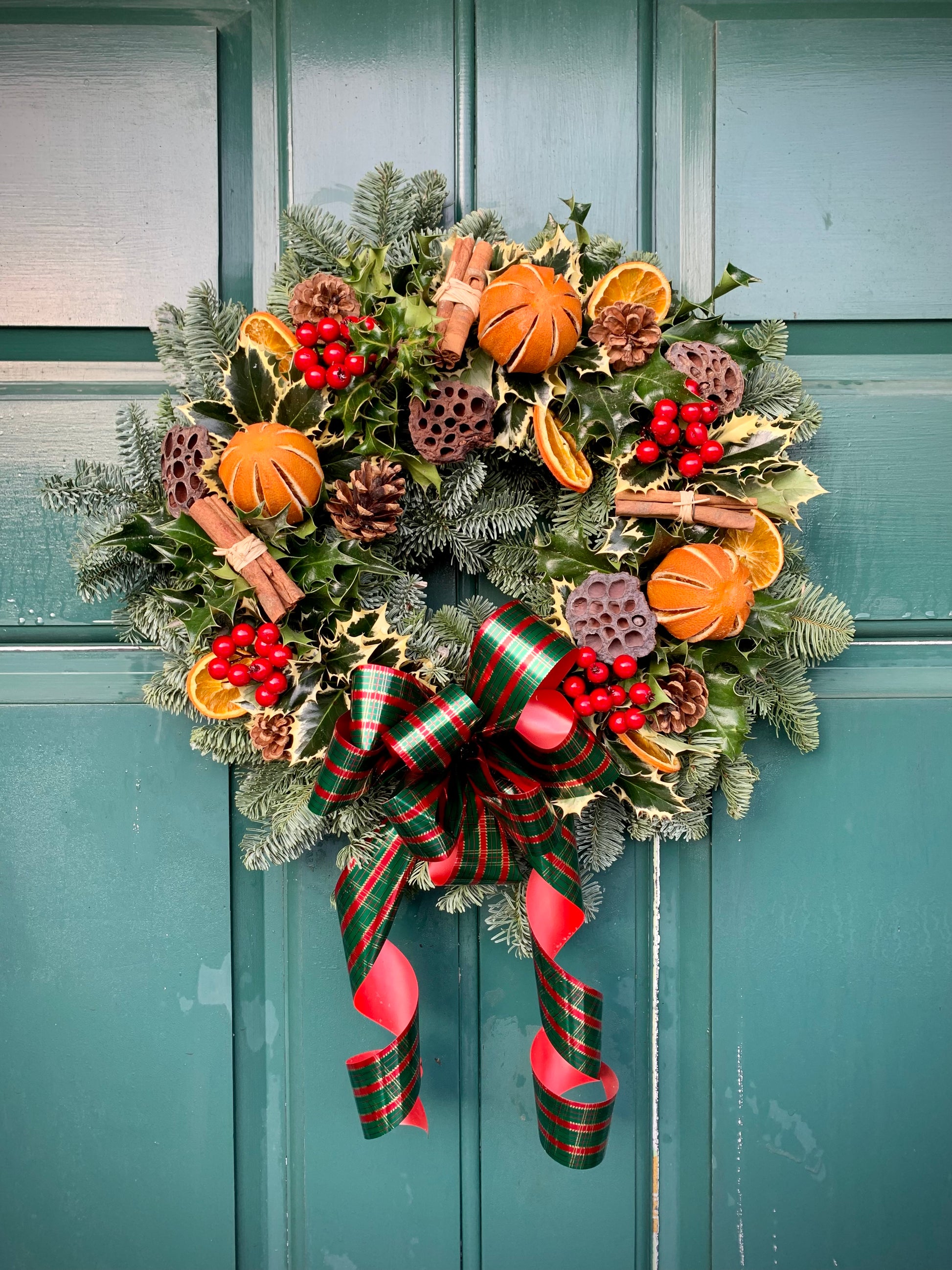 Pre Order - Available from 22nd November onwards Please Note: Free In store collection and local van delivery (up to 12 miles & priced by distance) available for this product For collection please click 'Pickup In Store' and select your desired collection date/time from the calendar For local delivery select shipping and click 'Local Delivery' at checkout, ensuring to leave your desired delivery date in the instructions box. Minimum of 24 hours notice, same day delivery is not available. Local delivery is NOT available when using express PayPal checkout This decorative wreath is lovingly made in-house by our talented floristry team and is...